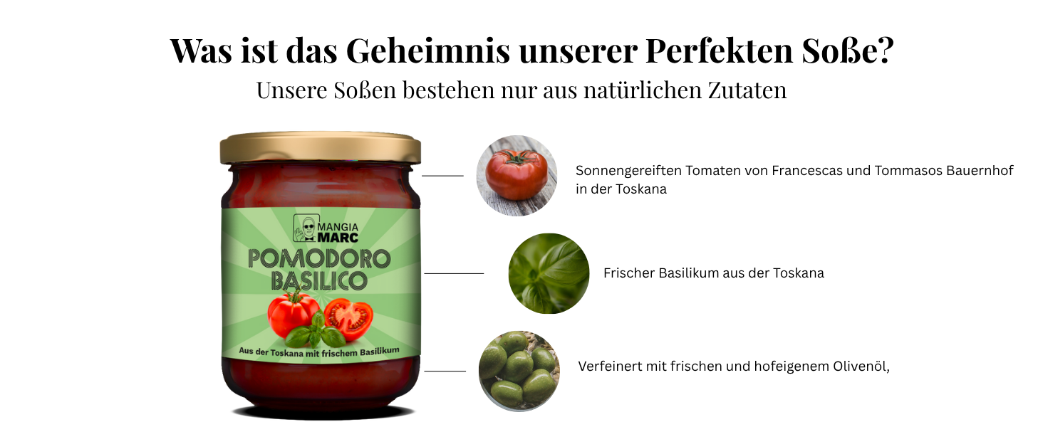 Hol dir ein Stück Italien nach Hause! Unsere MangiaMarc Tomatensoße mit Basilikum wird aus sonnengereiften Tomaten von Francescas und Tommasos Bauernhof in der Toskana hergestellt. Keine Gewächshausluft, sondern pure italienische Sonne verleiht den Tomaten ihr einzigartiges Aroma – fruchtig, aromatisch und natürlich lecker.