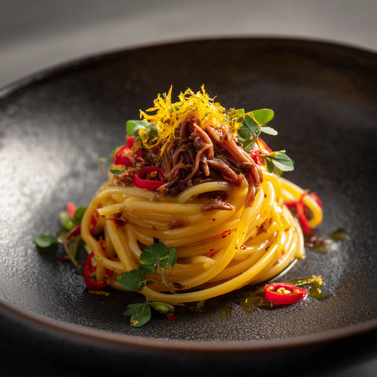 Diese Tagliolini haben Biss – nicht nur in der Textur, sondern auch im Geschmack: Die fein geschnittenen Nudelbänder werden mit echtem Chili verfeinert und bringen eine angenehm pikante Schärfe direkt auf deinen Teller.