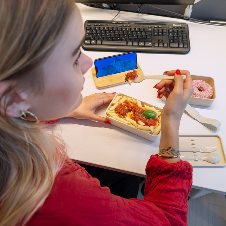 Als besonderes Extra bekommst du eine Lunchbox mit integriertem Besteck und praktischem Handyfach gratis dazu – perfekt für dein Desktop Dining im Büro oder unterwegs.